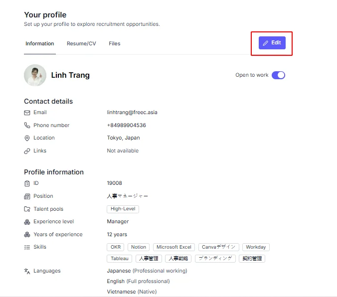Tab Information help you take overview about your profile, you can Edit your profile by clicking Edit button.