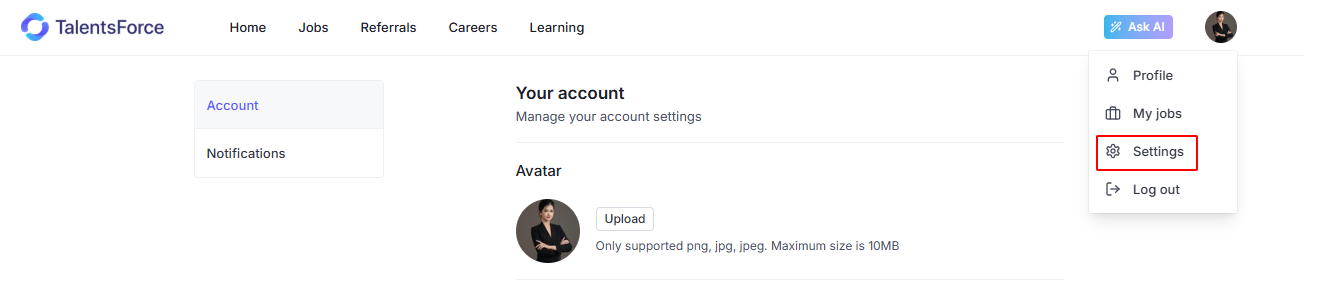You can access Account Settings by clicking on your avatar icon in the top-right corner of the page, then selecting Settings.