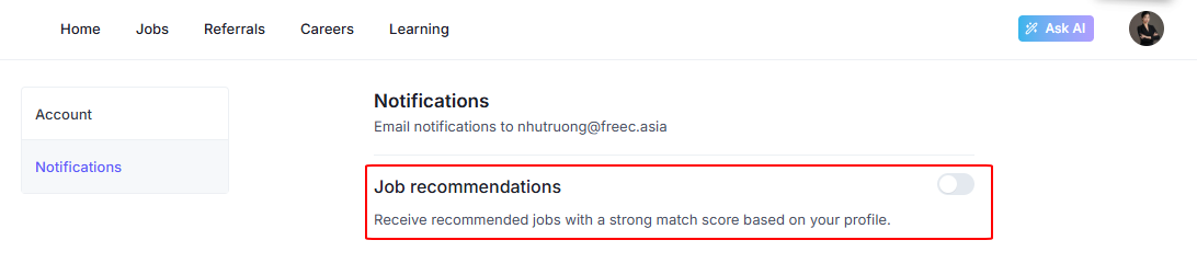 Currently, you can enable or disable Job Recommendations emails.