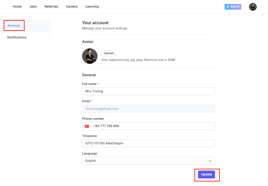 This section includes two main tabs: Account and Notifications.