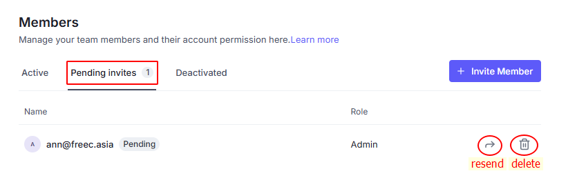After sending an invitation, you can check to see if a user has accepted an invitation by going to the Member section.