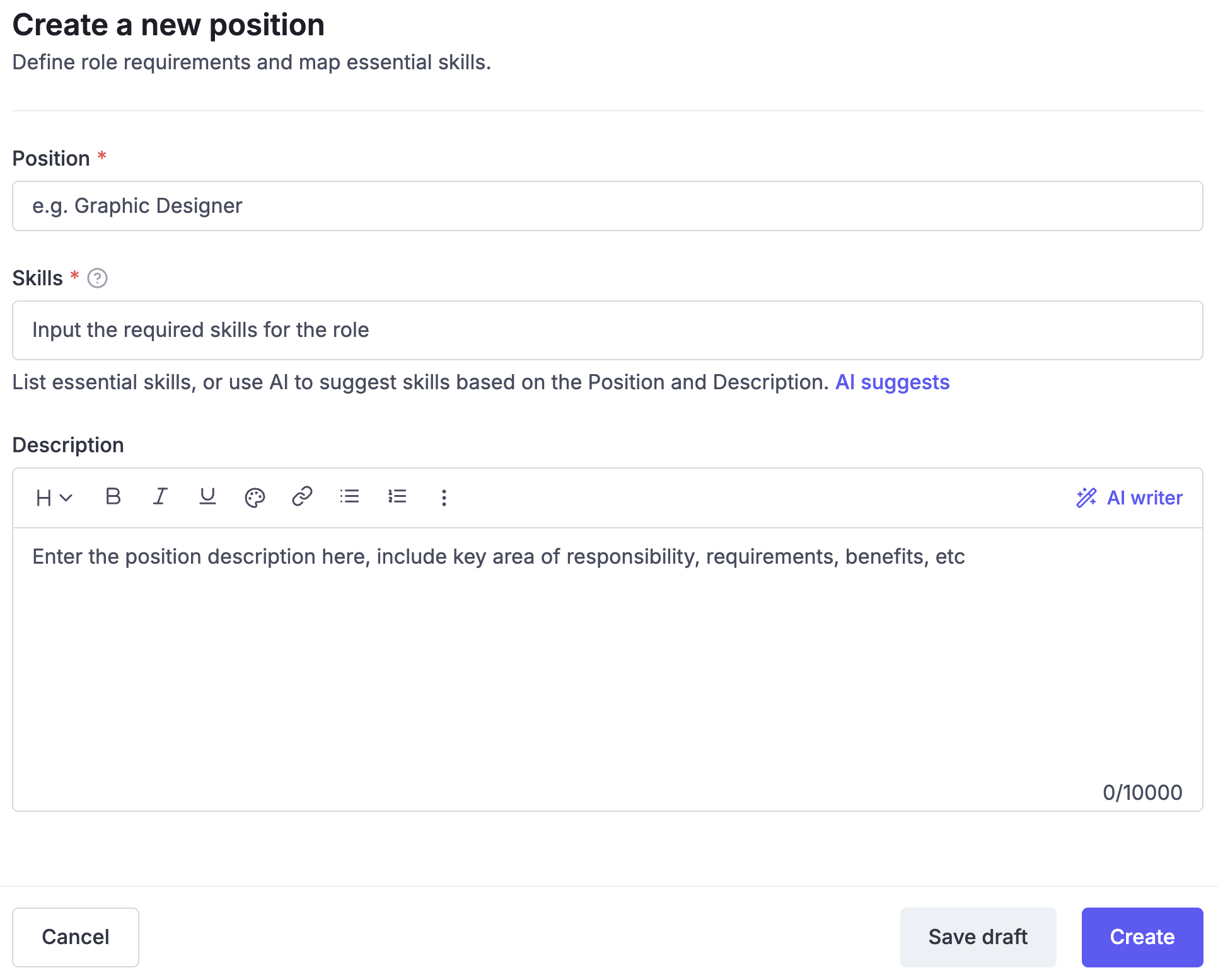 Tip: AI Suggest bases on the selected position and job description, and may recommend relevant skills automatically