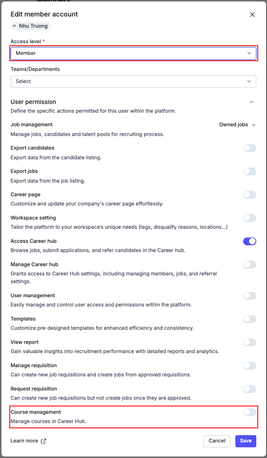 Member: Requires permission Course Management, managed from the Settings → Member page