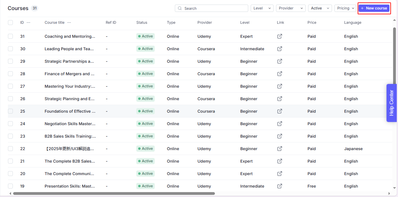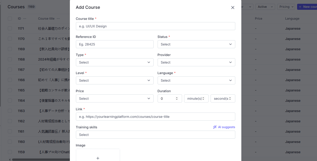 Fill in the required information in the Course Form (e.g., Title, description, training skills, link, duration, etc.).