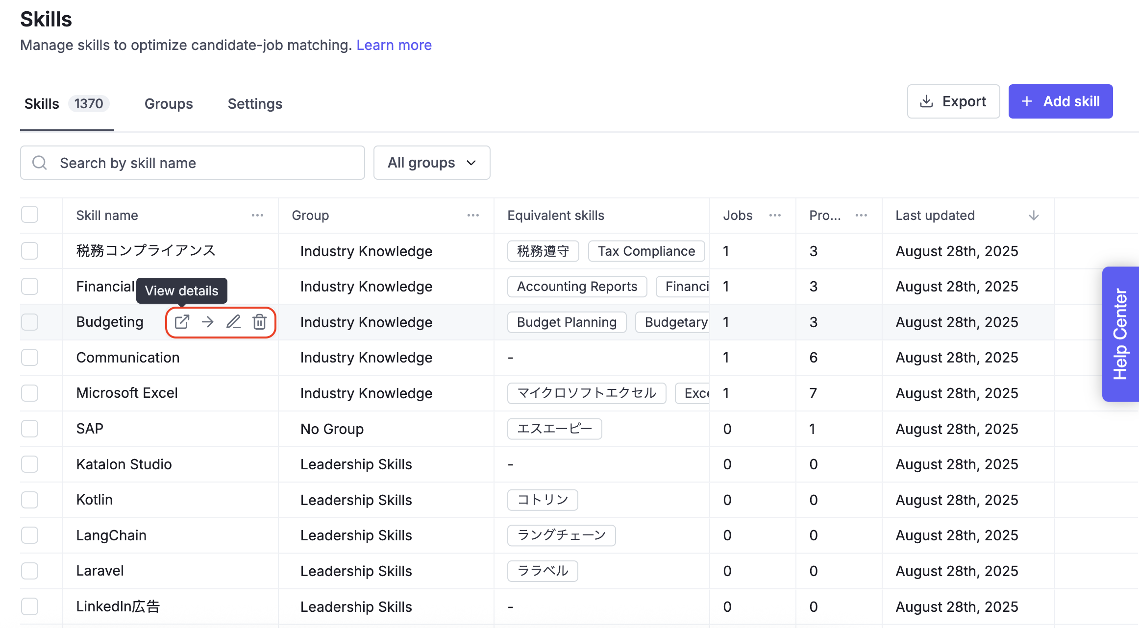 AI Suggest will propose equivalent skills (alternative names, abbreviations, or translations) and add them automatically.
