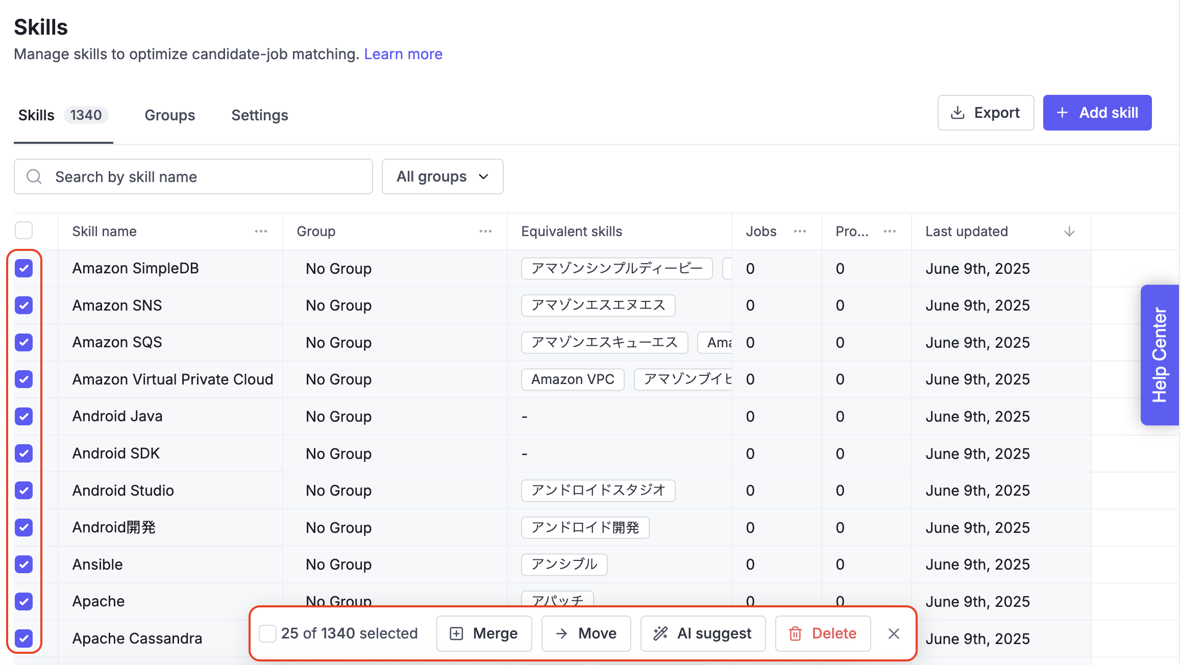 Available when you select multiple skills. These allow you to merge, move, delete, or get AI-powered suggestions across many skills at once.