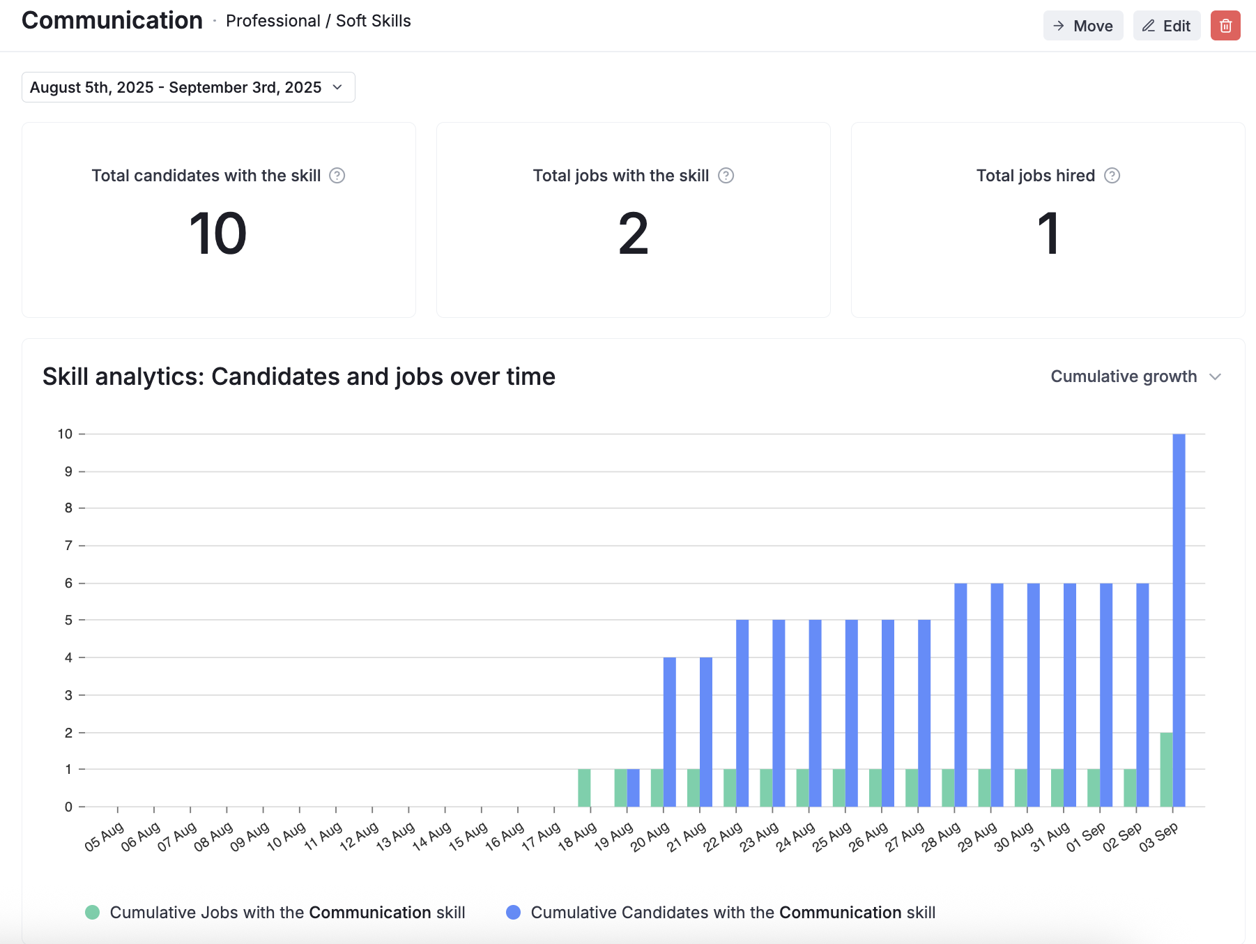 Cumulative growth: Shows the cumulative number of candidates with the skill and related job postings.