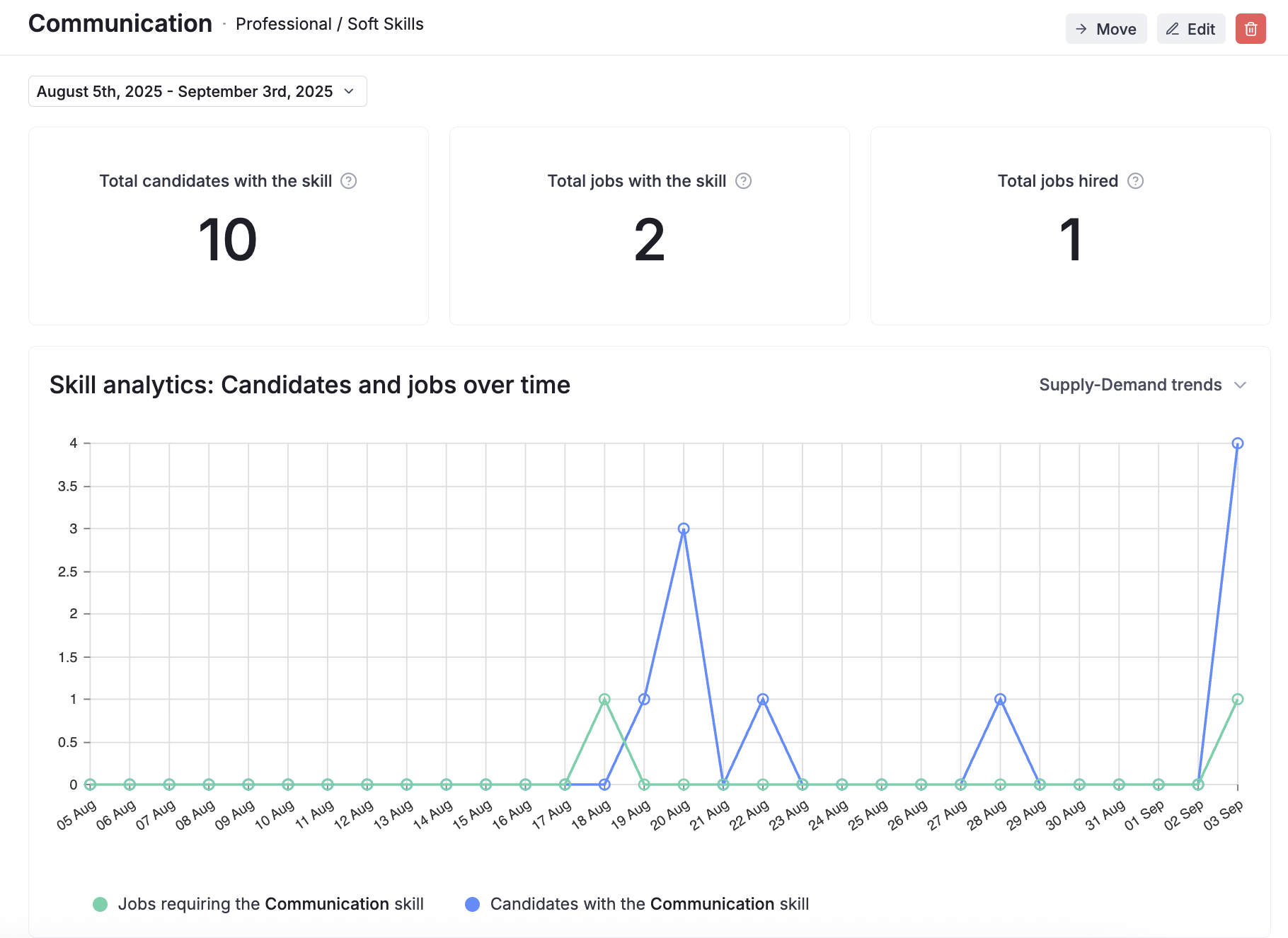 Supply-Demand trends: Compares the number of candidates who have the skill with the number of jobs requiring the skill.