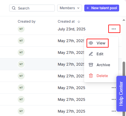 To open the Talent Pool Detail page, you can click on the Talent Pool Name or click the More button then select View.