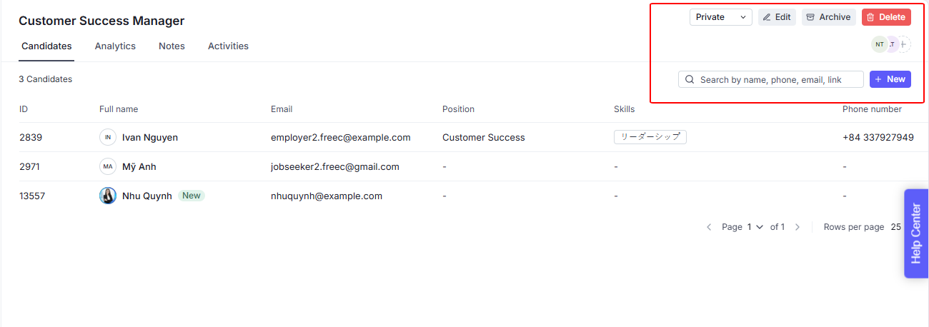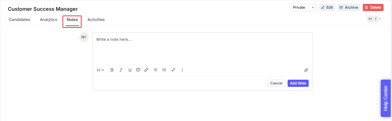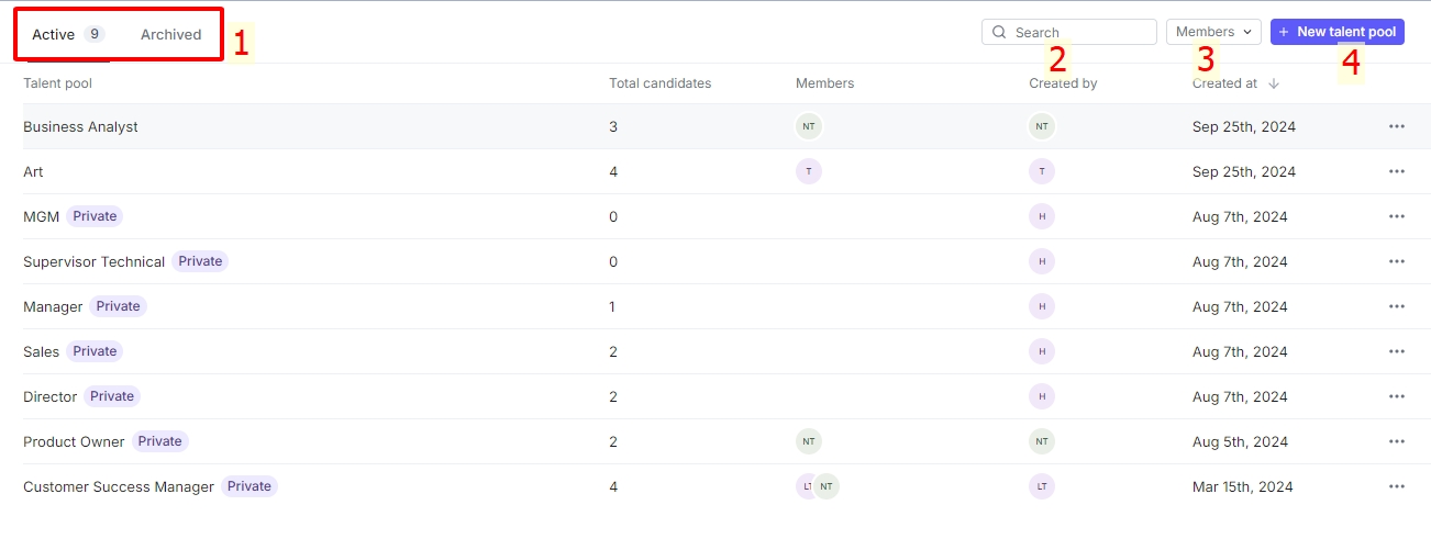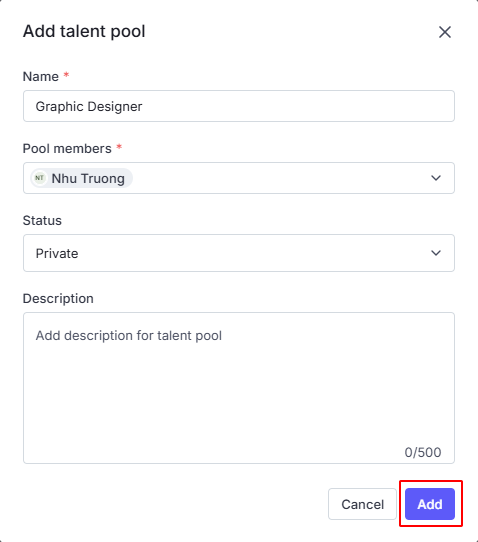 Pool Members: You can add other members to join the Talent Pool who can contribute to sourcing and reusing talents. Pool Members can view all candidates within the pool. They can also add new candidates and take notes directly in the pool.