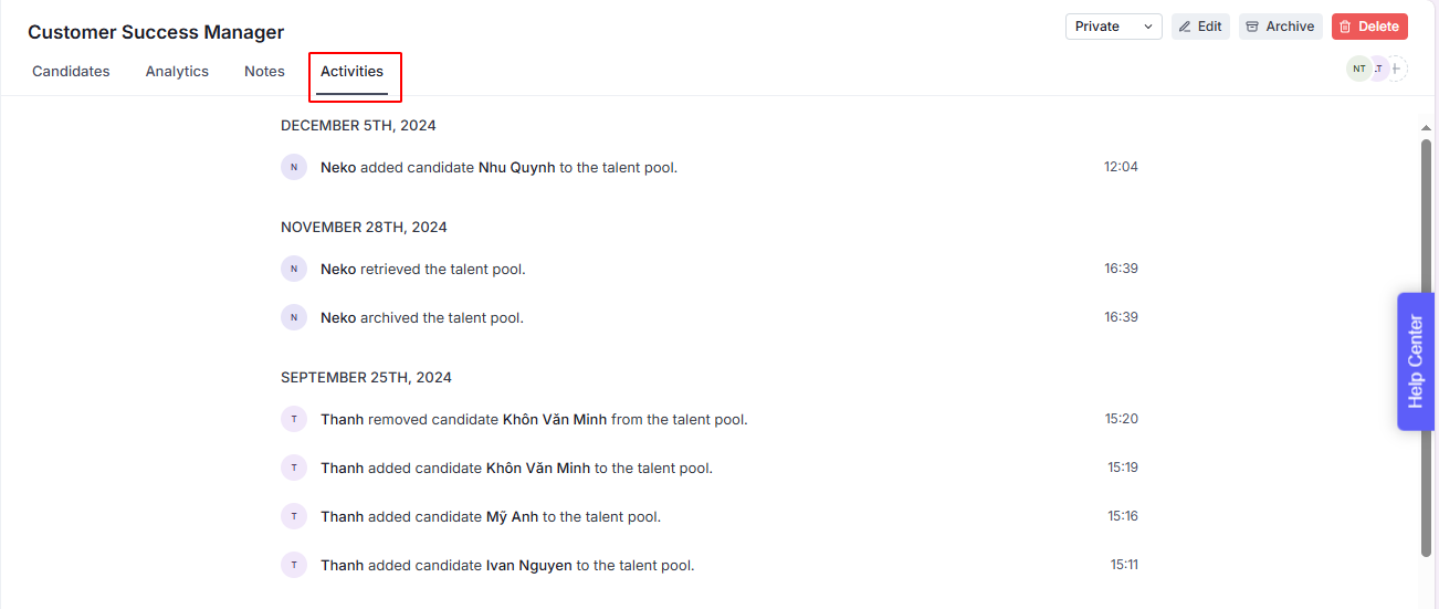 You can track and view all the activities related to the pool, such as assigning a pool member, taking notes, adding candidates... These activities are recorded by time, from the oldest to the newest, and include details about the recruiters who acted.