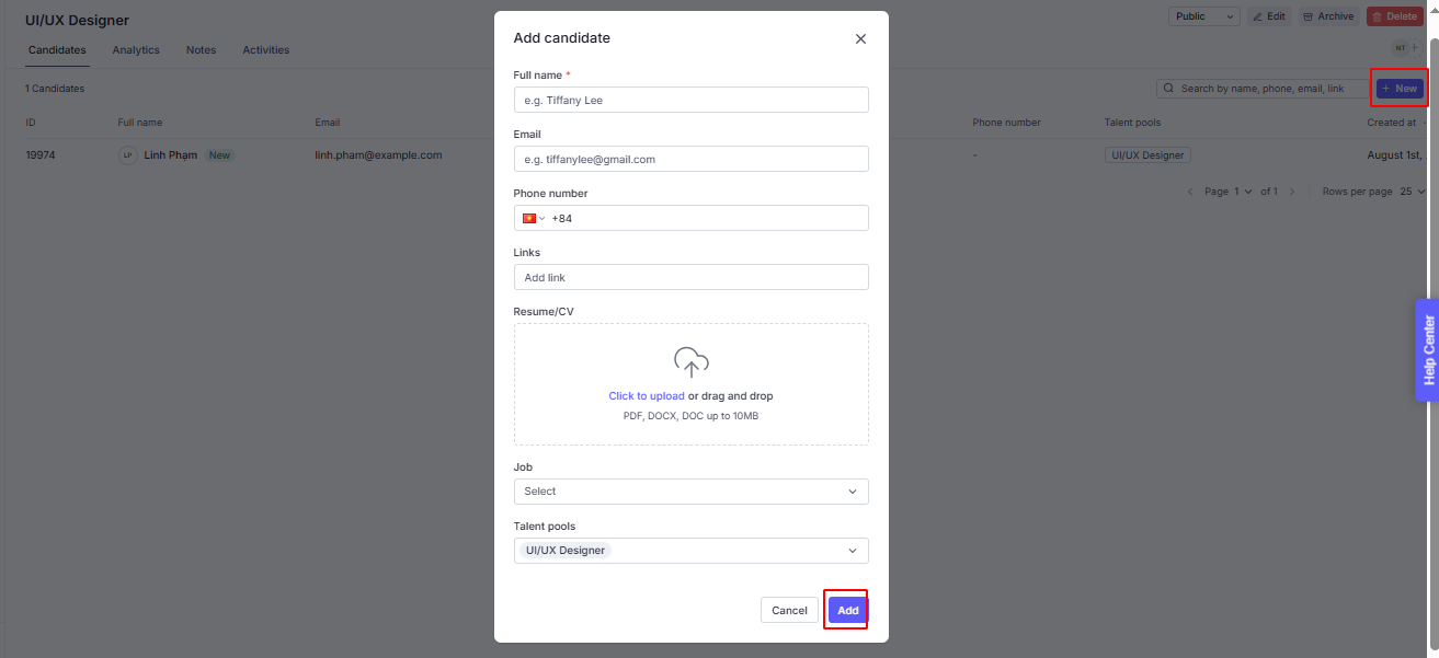 In the Profile Information section, click on the Talent pools field and select the talent pool that you would like to add candidates to. You may add the candidate to many talent pools.
