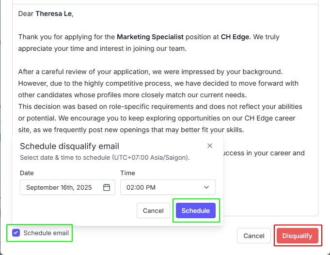 Schedule email: Tick the checkbox to schedule the email for a later time that best fits your hiring process, then click Schedule.