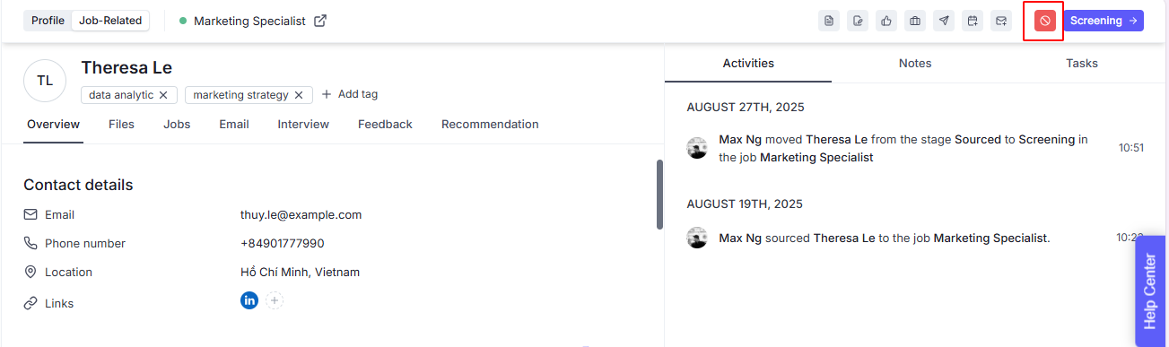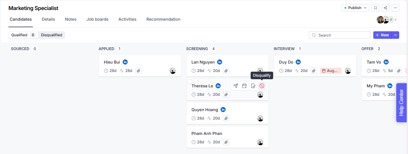 Use the Disqualify action when a candidate does not meet the job’s requirements or is no longer relevant for the role. Disqualifying removes the candidate from the active pipeline while still keeping their profile and history for future reference.