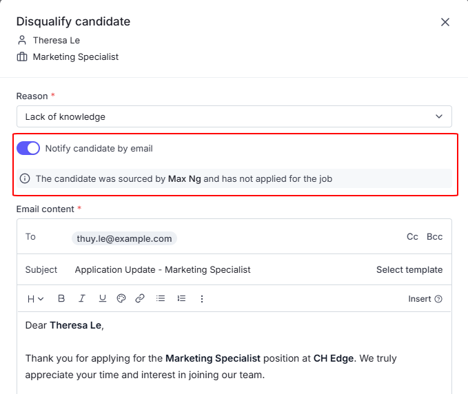 Note: If you try to send a disqualification email to a candidate who was not self-applied, the system will display this reminder to ensure you double-check before sending, since sourced candidates may not expect a rejection email in the same way as applicants.