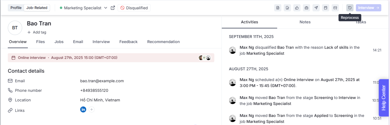 If you would like to re-process a candidate who was disqualified from a specific job, you can use the Re-qualify feature. This action restores the candidate to the active hiring pipeline, allowing your team to move them forward through the job’s stages.