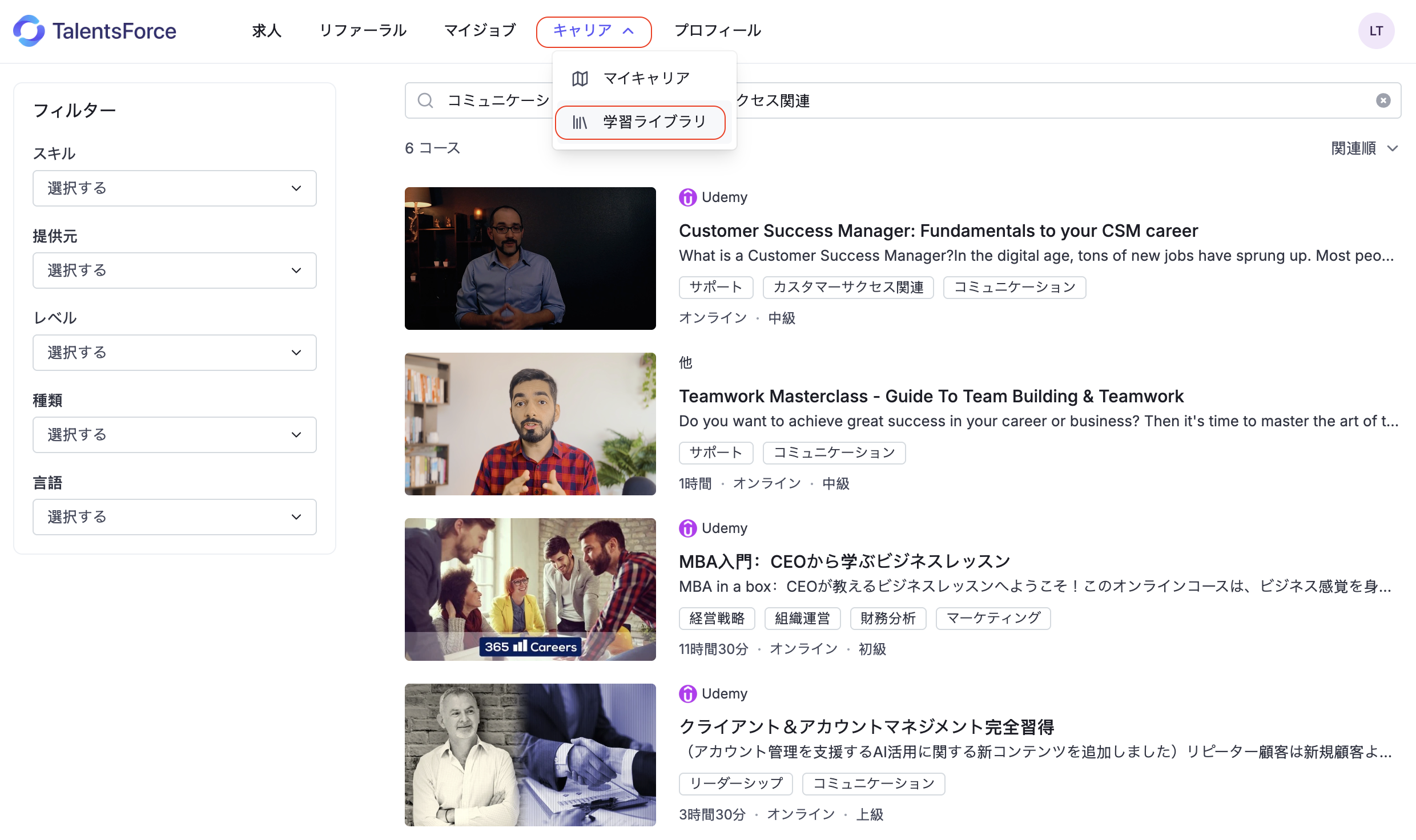 Courses in the Learning Library also appear as Recommended Courses in other areas of the Career Hub, such as My Career and specific Job pages, ensuring you see learning options aligned with the items you are viewing.