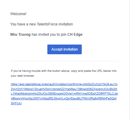 Check your inbox for an email from support@talentsforce.io with the subject:[User Name] has invited you to join [Company Name] on TalentsForce!