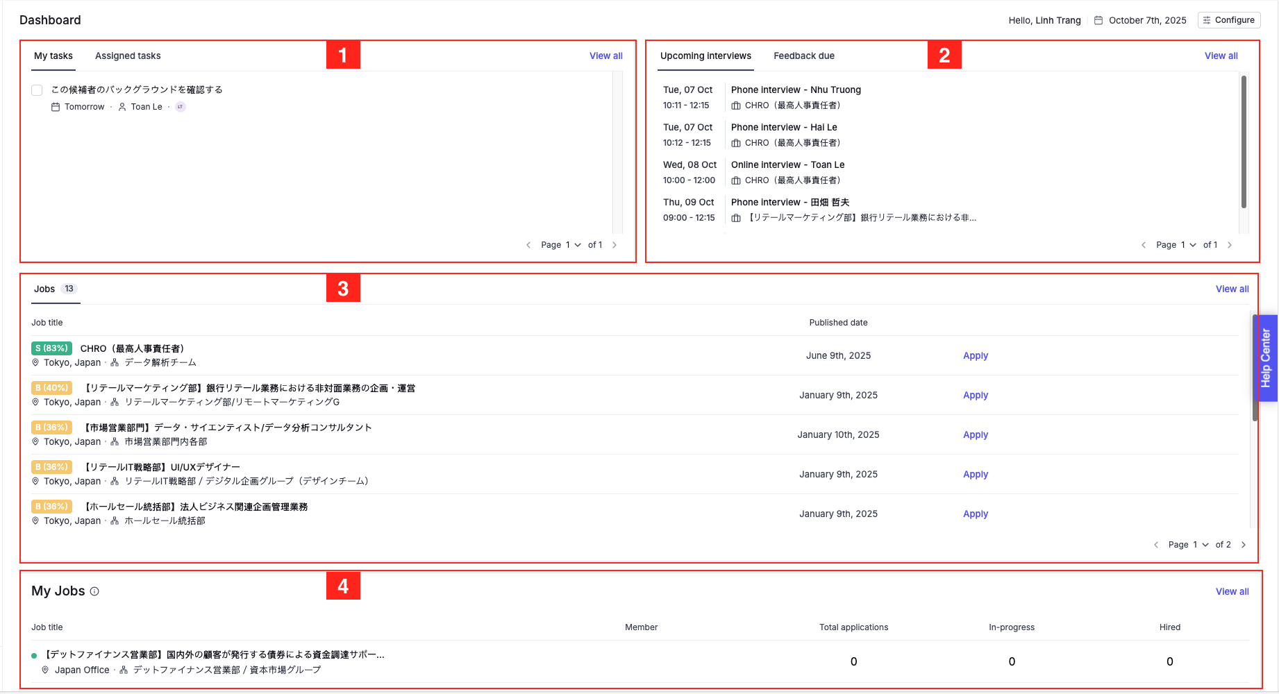 From here, you can view your tasks, upcoming interviews, and feedback due, as well as view jobs on the Career Hub and track the status of your assigned jobs.