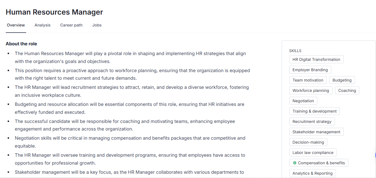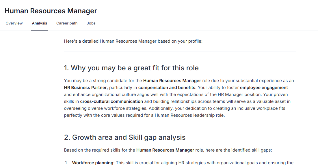 This tool helps you see how your current profile: your position, skills, experience, education, and certifications, compares with your career goal. AI will show you where you’re a strong match, where you can grow, and what actions to take so you can plan your next move with confidence.
