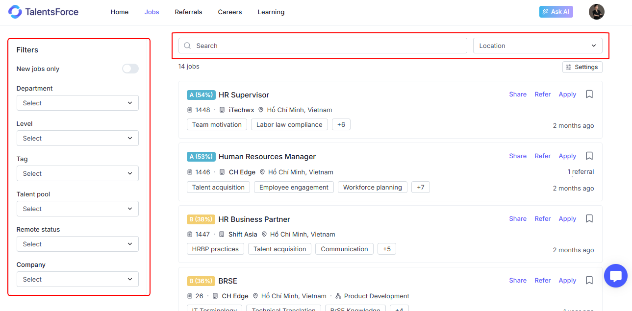 The Jobs page helps you explore available opportunities, check your match level, and take actions like Apply, Refer, or Bookmark.