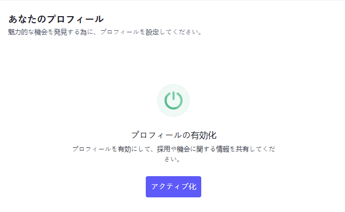 プロフィールを有効化することで、採用機会に向けて自身の情報を共有することに同意し、[利用規約] を確認・同意したことになります。