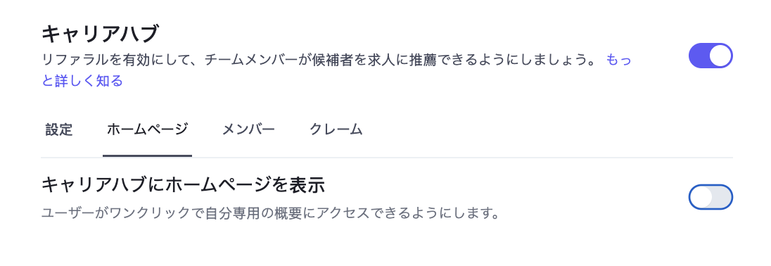 「キャリアハブにホームページを表示」トグルを使用して、ホームページの表示/非表示を切り替えます。