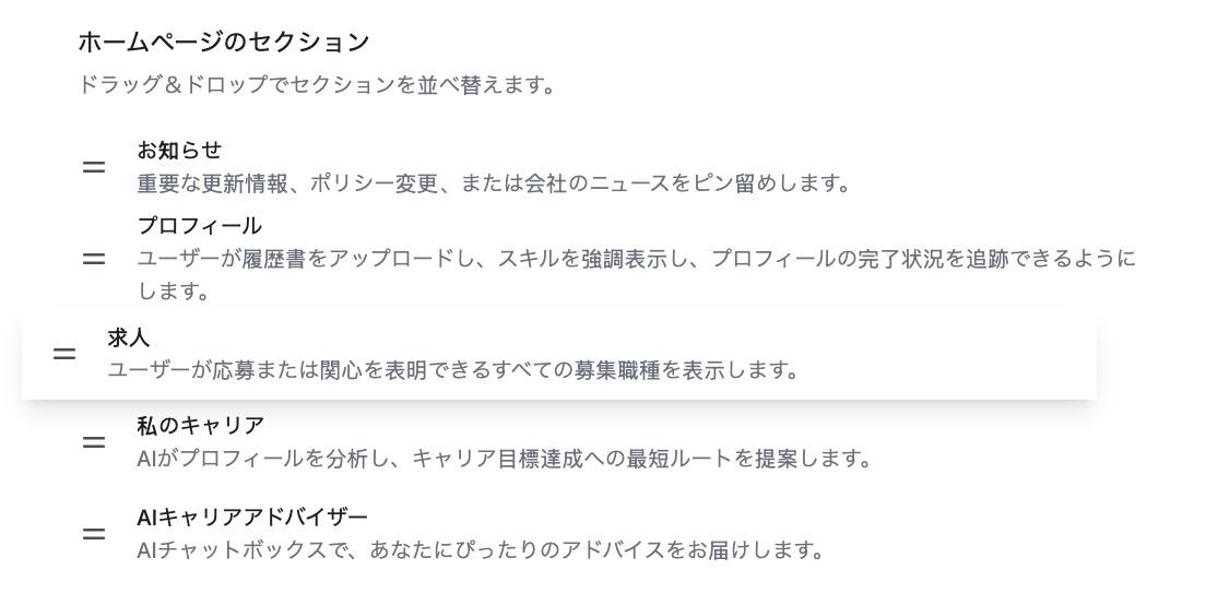 「ホームページのセクション」では、ホームページに表示されるセクションと順番を設定できます。