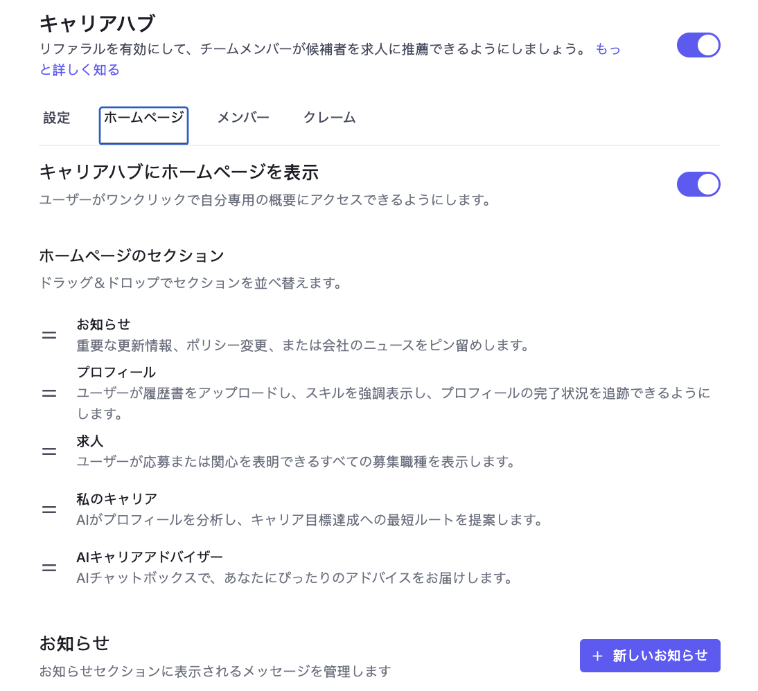 キャリアハブを有効化すると、ホームページはデフォルトで有効となります。