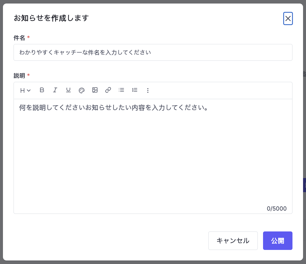 「+ 新しいお知らせ」をクリックし、内容を入力します。