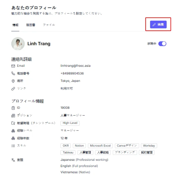 情報タブでは、プロフィールの概要を確認できます。「編集」ボタンをクリックすると、プロフィールを編集できます。