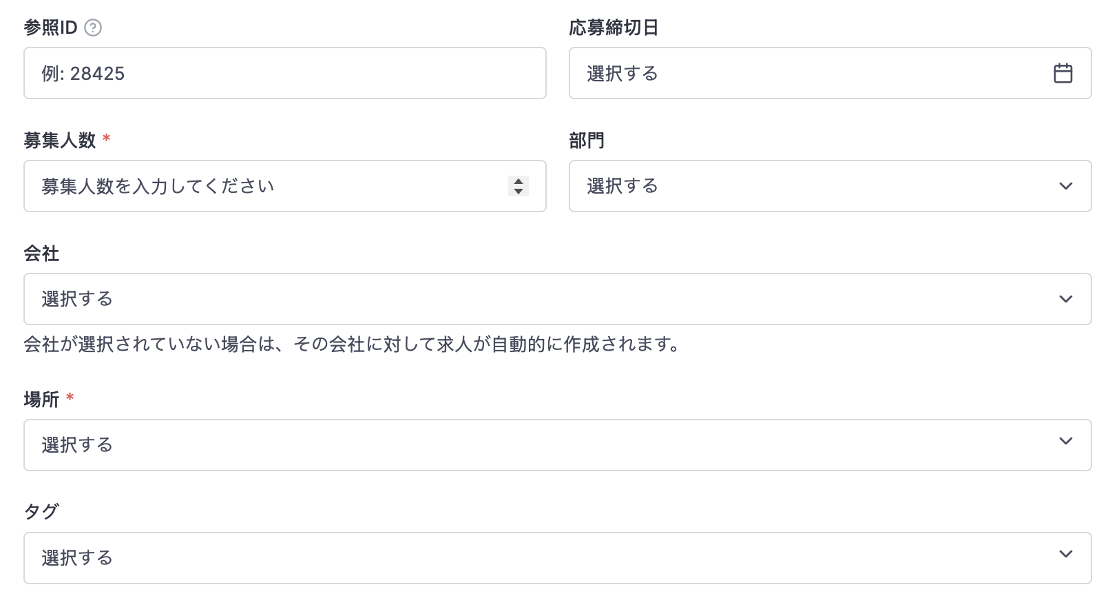 フィールドを空欄のままにすると、その求人は自社内での 内部募集(internal hiring) として扱われます。