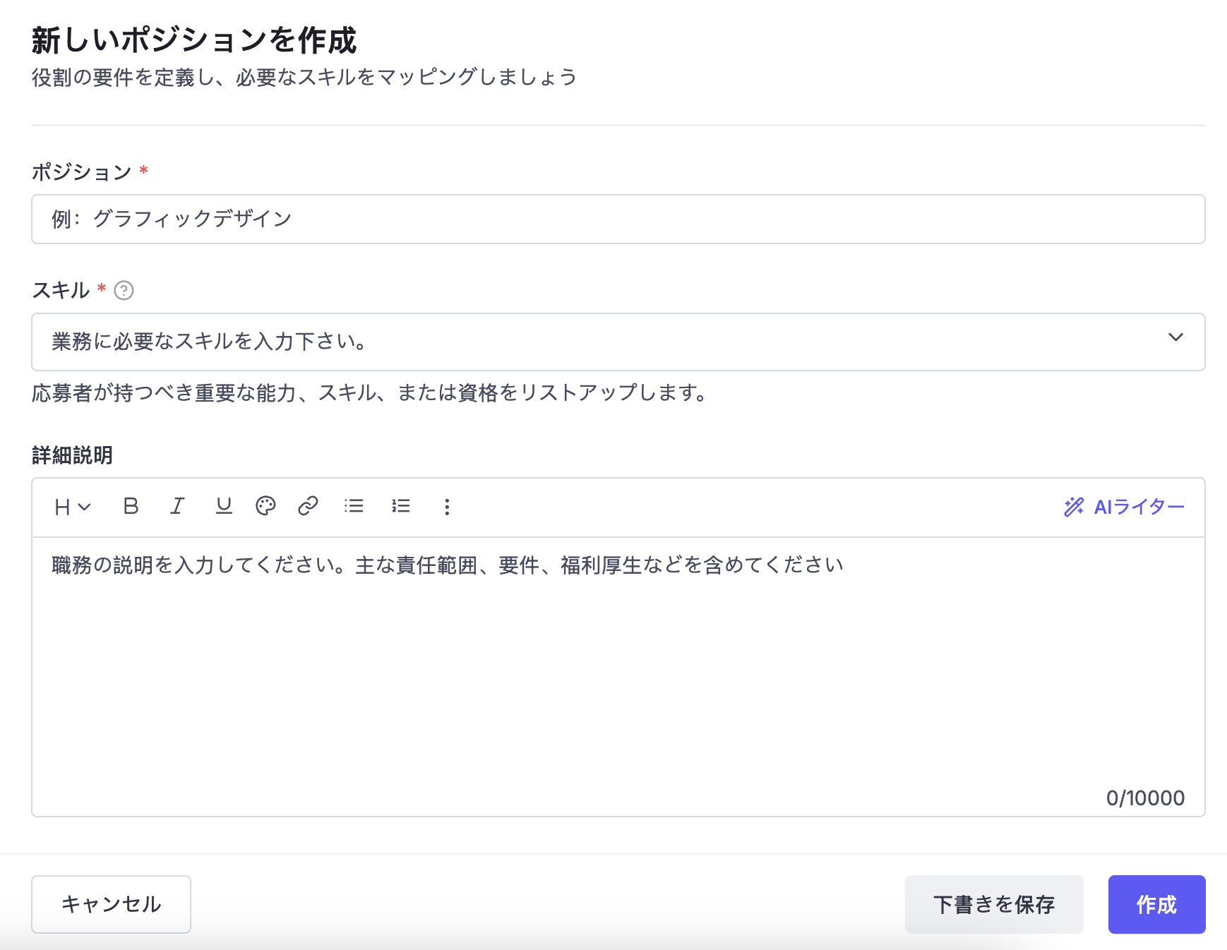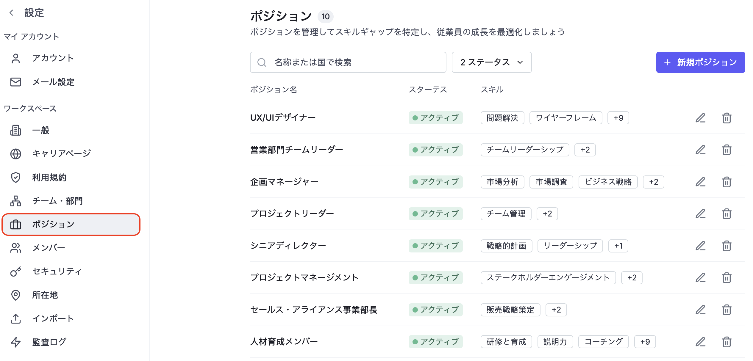 スキル – ポジションに関連付けられた標準化されたスキルのリスト。