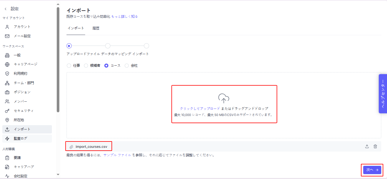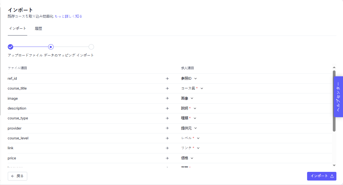 サンプルファイルに基づいて、各カラムの入力方法をガイドしています。正しい情報が入力されるように、コース一覧を更新してください。