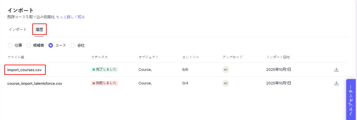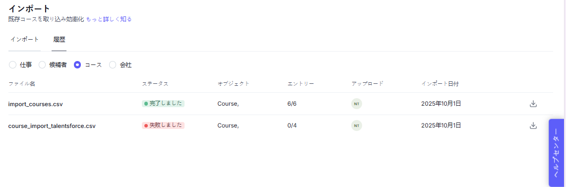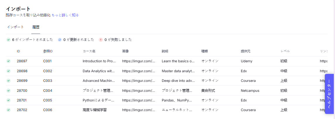その後、「履歴」をクリックしてインポートのステータスを確認できます。