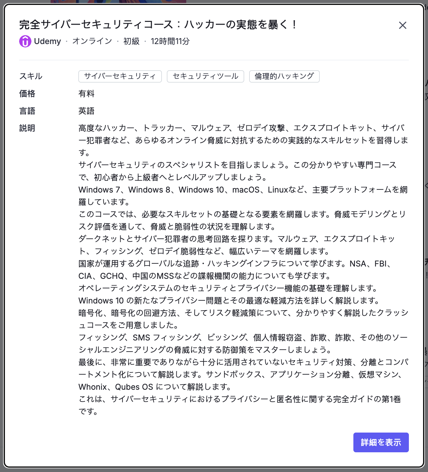 ポップアップ画面から 「詳細を表示」 をクリックすると、提供元の公式コースページに移動し、フルコンテンツにアクセスできます。