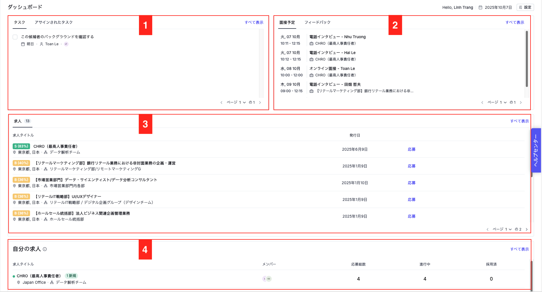 予定されている面接や未処理のフィードバックを一目で確認でき、スムーズな調整が可能になります。