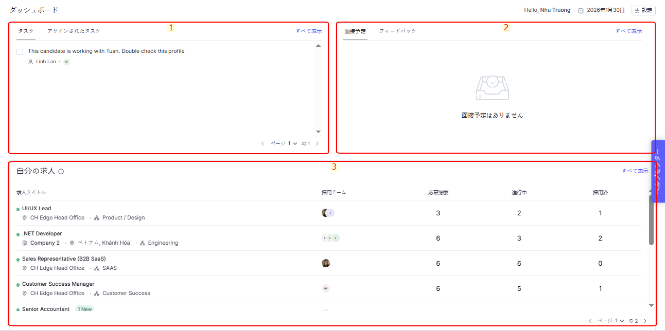 予定されている面接や未処理のフィードバックを一目で確認でき、スムーズな調整が可能になります。