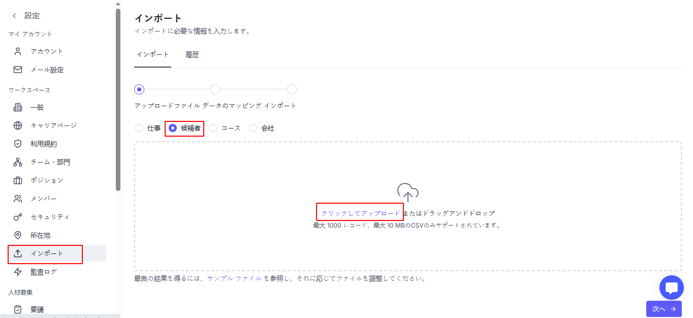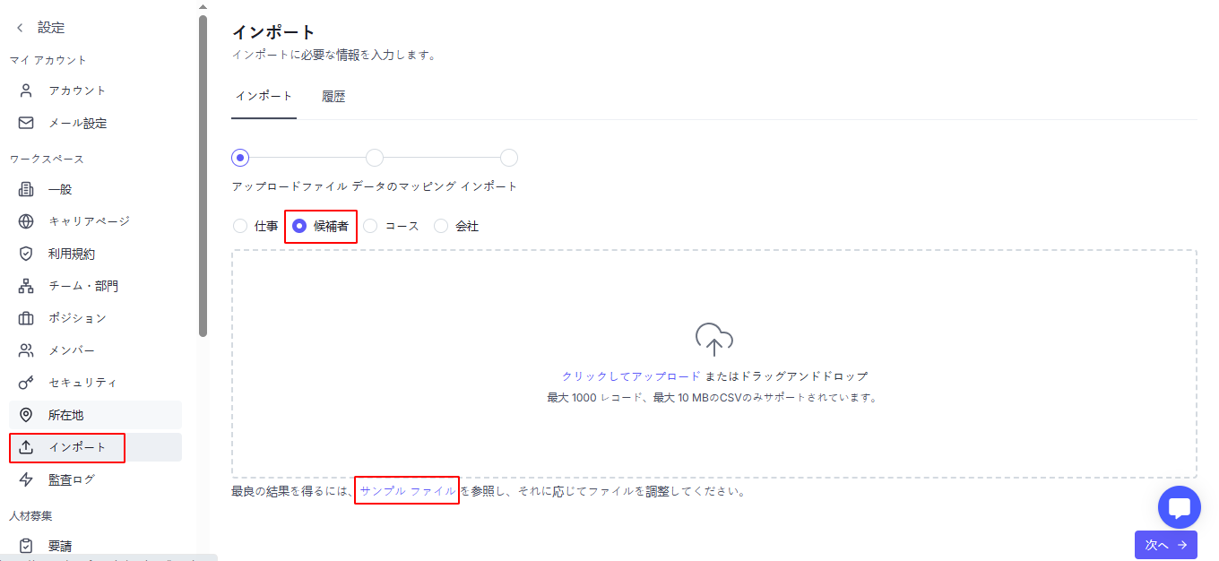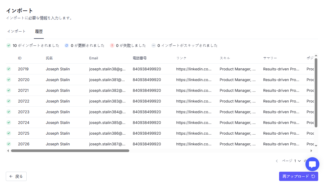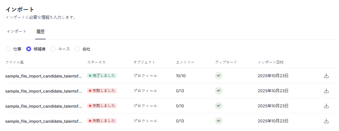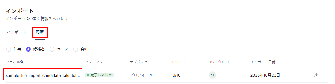 Updated At(更新日) – 候補者プロフィールの最終更新日時。任意入力、指定の日時フォーマットに従う必要があります。