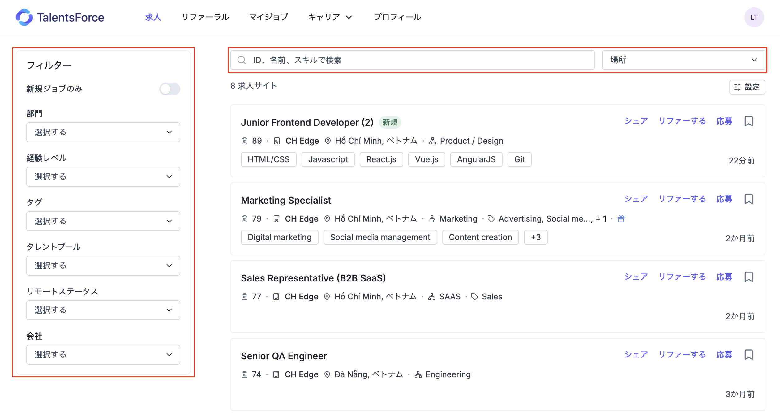 左側の フィルター ボックスと上部の 検索バー を使って、希望条件に合った求人を探すことができます。