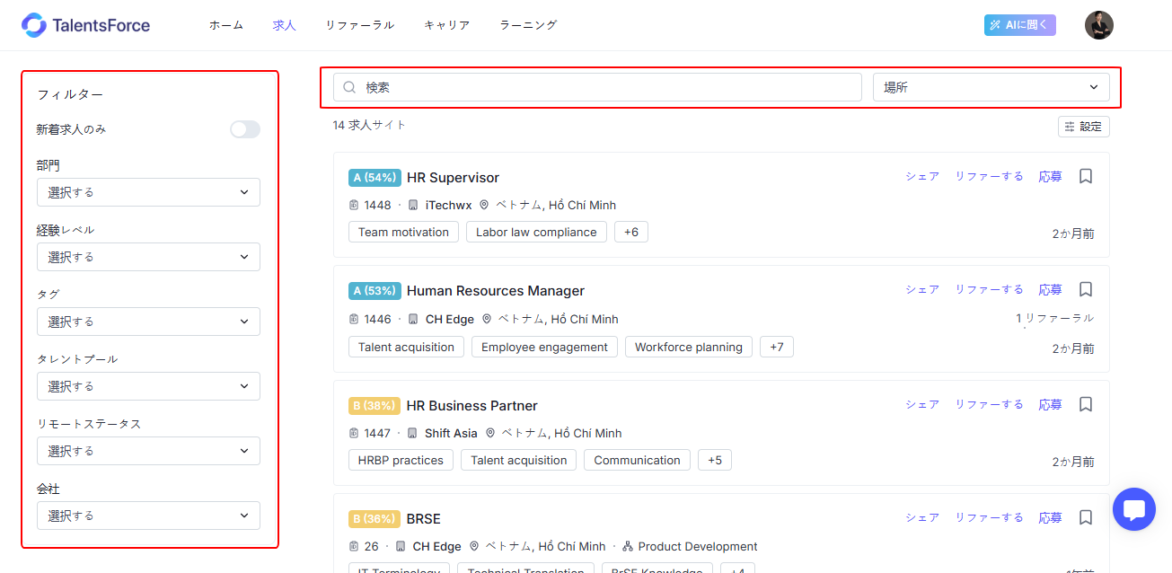 左側の フィルター ボックスと上部の 検索バー を使って、希望条件に合った求人を探すことができます。